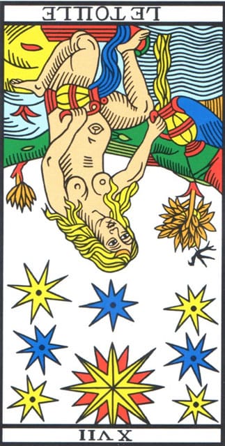 Perché sprecare i doni e le energie a nostra disposizione? Perché coltivare un progetto e poi non prendersene cura nel modo giusto? È ciò che ci domanda la Stella quando si presenta rovesciata. Cattivo investimento di energie, ma anche di beni materiali. Una femminilità non vissuta appieno e con consapevolezza. Una funzione di servizio nei confronti del prossimo in cui non ci si riconosce; mancanza di aspettative e speranze nel futuro.