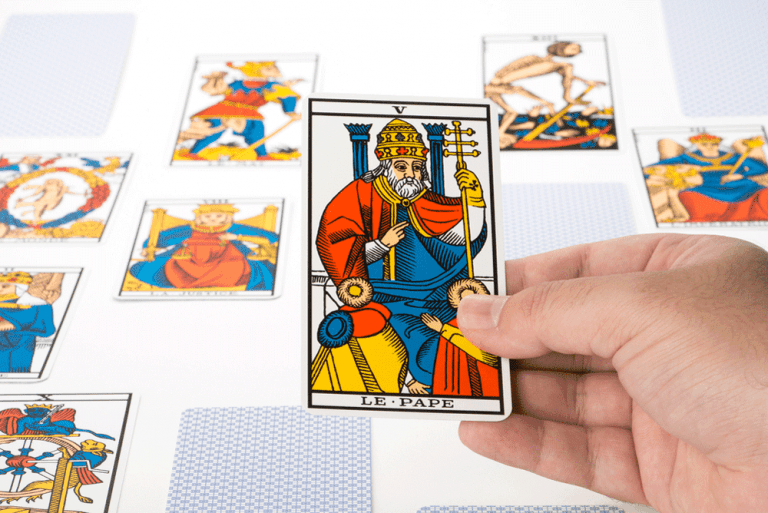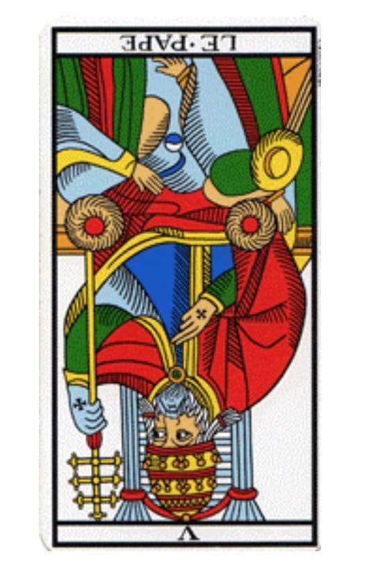 Il Papa è un pontefice, crea un ponte nella trasmissione della conoscenza. Questa fase è importante: chi non trasmette, non evolve. Indica anche il momento in cui è necessario darsi delle regole, una morale. Ma quando il Papa è rovesciato può indicare una totale assenza di etica o di morale, un eccesso di dogmatismo, una comunicazione ingannevole o inefficace. Un falso maestro, un insegnamento non adeguato. Problemi con il padre.