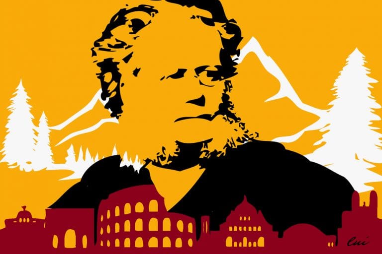 Da Trieste a Roma per settimane di viaggio non lascia tracce di sé. Lo ritroviamo a Palazzo Correa, in un’osteria del Tritone, a Genzano, ad Ariccia, tra il lago di Nemi e via dei Due Macelli, e a vagabondare con lo zaino in spalla per la campagna romana, quando i briganti non gli sembrano così pericolosi come si dice, e fra le rovine della scuola di Cicerone. Lo scopriamo seduto sulle gradinate delle chiese dei Castelli romani, a godersi i giochi dei ragazzi che si riversano a frotte nelle piazze nel freschetto vespertino, o in compagnia degli artisti scandinavi, gente umile, poco influente di cui si circonda per proseguire, in solitudine, e fra stranieri, i colloqui con il suo popolo, con quello slancio che mitizza la Scandinavia. Vive con una pienezza nuova, persino quando la febbre quasi l’atterra, ma con l’immaginazione sempre rivolta alle suggestioni del mondo scandinavo. A Roma visita le gallerie con Dietrichson, storico dell’arte, e gode della quiete di un tempo sospeso e della libertà che il governo pontificio assicura, di quell’isolarsi di una città nelle memorie che evoca in mezzo ai tumulti di fine ottocento, un atteggiamento che ben si sposa con la sua naturale ritrosia. Incita gli appartenenti al circolo scandinavo ad abbonarsi all’Osservatore Romano e deplora la pace persa quando Roma si unisce al Regno, ma cita il risorgimento italiano che gli appare come esempio per tutta l’Europa e sintesi dell’ideale romantico di sacrificio offerto per le sorti della nazione. Scende un giorno d’estate da Ariccia a Roma ed entra in San Pietro, e là gli si rivela chiaramente la forma per proseguire il poema di Brand: “riacquista una perduta sapienza” nel mitigare la natura eroica del pastore luterano e il suo estremo protestantesimo nella ricerca della virtù, con la calma idillica di Roma. Dentro lo spazio armonioso della basilica, nell’equilibrata misura in cui si definisce, ritrova la parola di conciliazione fra il divino e l’umano.