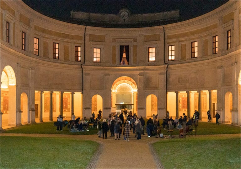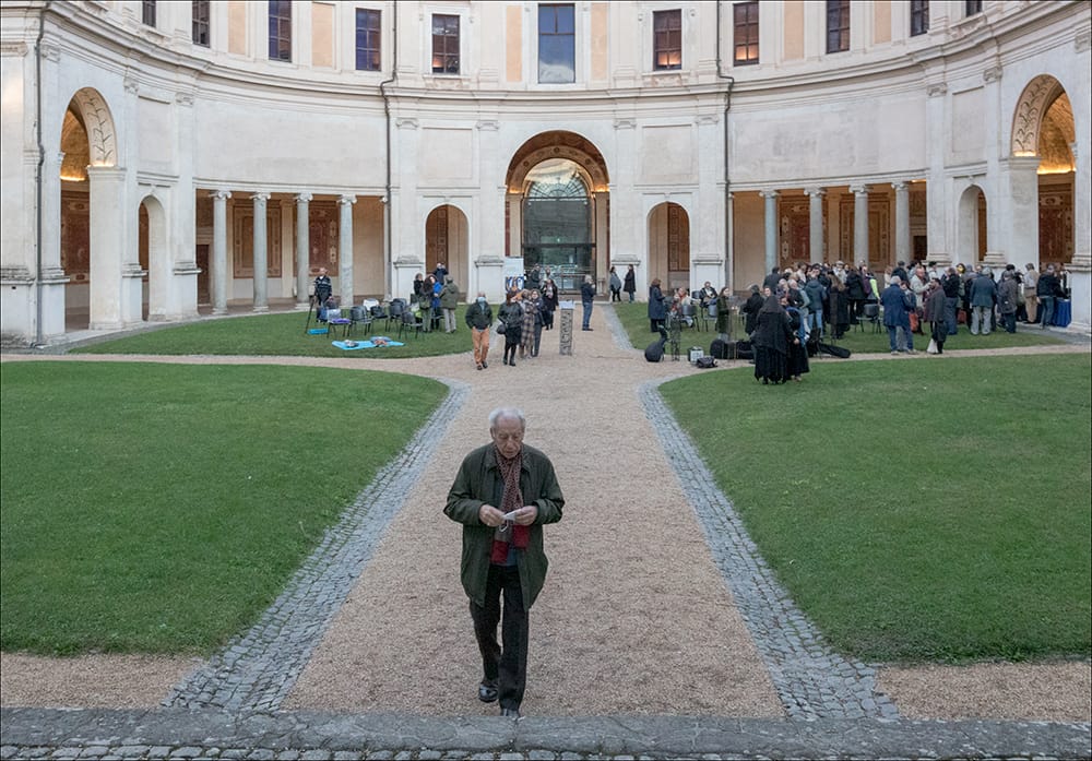 Il salto di una settimana nel nostro appuntamento quindicinale è valso l’impresa, consistita nel salutare l’alba in versi in una domenica limpida (la scorsa, 24 ottobre) divenuta poi rapidamente radiosa e nel condividere il primo caffè tutti insieme sotto il porticato illustrato dai cinquecenteschi affreschi di imitazione classica nel giardino romano più bello che c’è: il Ninfeo di Villa Giulia. Altra cornice, nella cornice, è la mostra di Oreste Baldini, BASTABUSTE, di cui la lettura poetica è indicata come evento collaterale, agli sgoccioli, pare, di una notte bianca che pochissimi di noi presenti hanno attraversato.