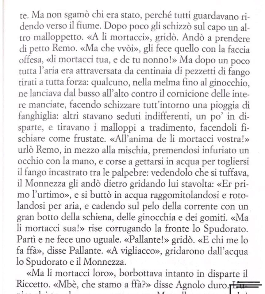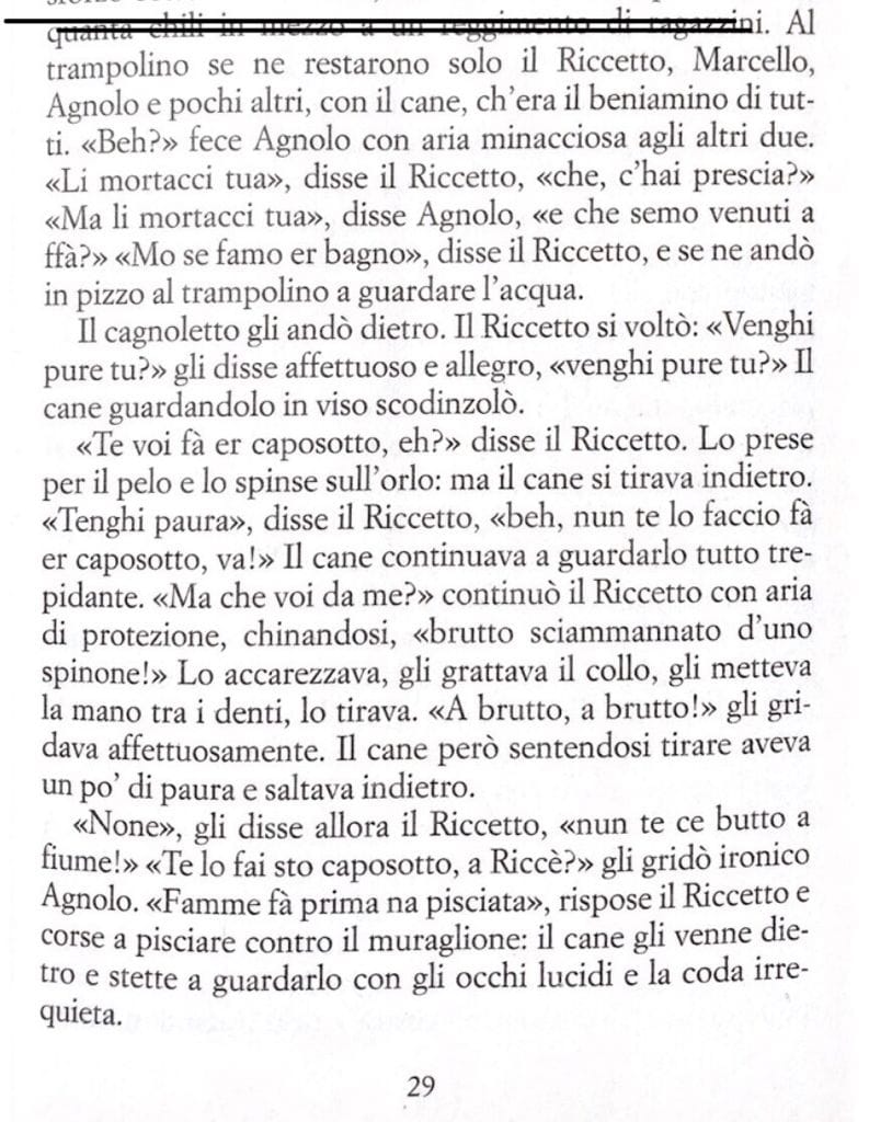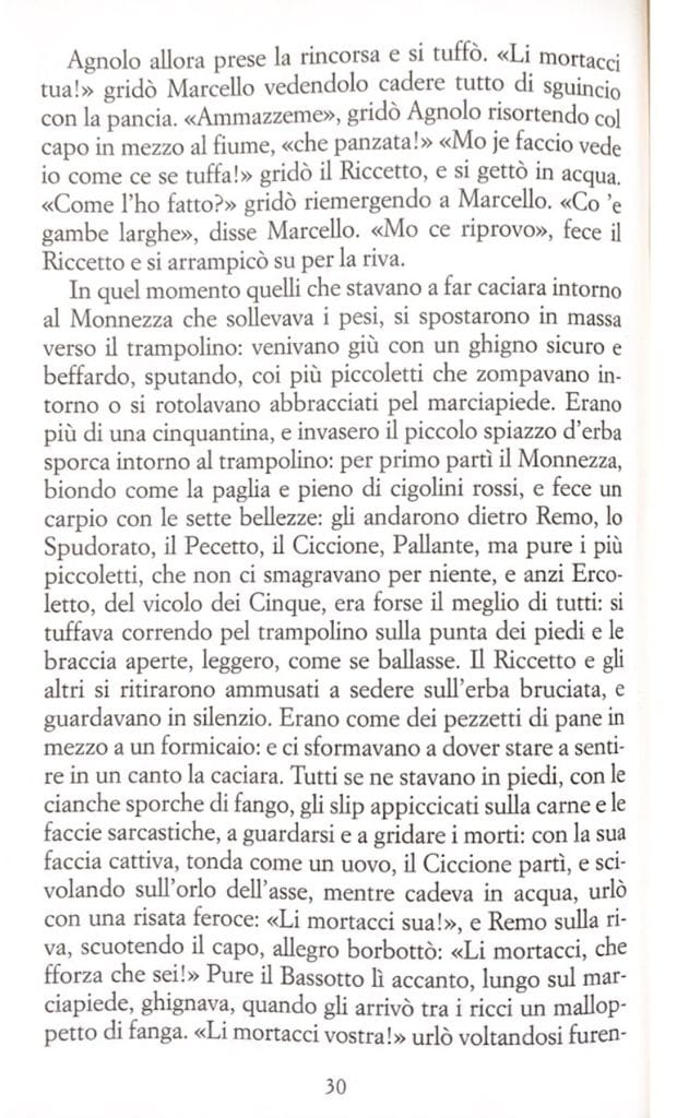 Questa settimana un pezzo da Ragazzi di vita del maestro Pasolini, in una scena di vita quotidiana del Riccetto e i suoi amici. La combriccola, dopo aver sgraffignato un po’ di cose in giro, si prende del tempo per fare qualche tuffo nel Tevere.