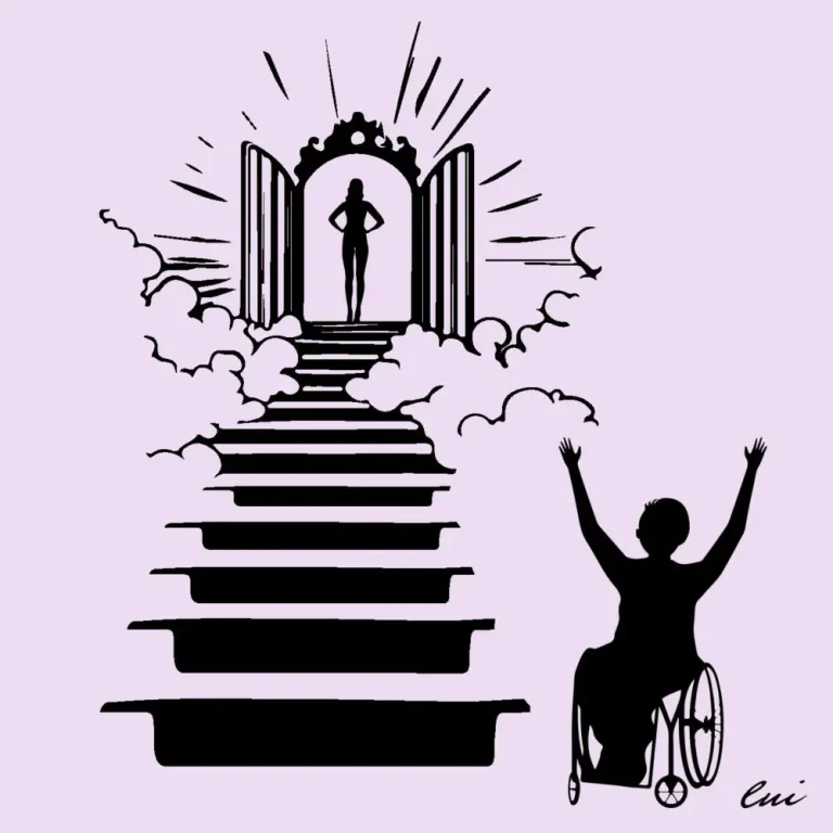 Sono morto, si sa che prima o poi succede, ma non mi aspettavo di trovarmi su una nuvola in movimento e di impugnare anche qui le mie stampelle. La nuvola si muove verso una scalinata bianca all’orizzonte. Si ferma e davanti a me la scalinata. Non riesco a vedere la cima.