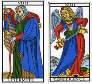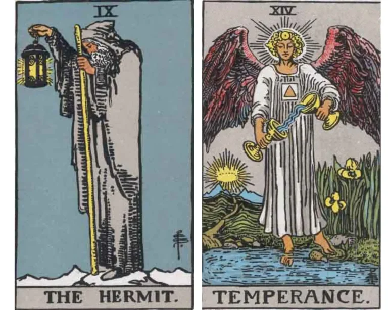 Questa settimana i Tarocchi ci invitano a rallentare, a prenderci il tempo necessario. L’Eremita percorre la strada della conoscenza cercando di fare luce dove non c’è. Lo fa con prudenza, in un luogo sicuro e protetto da Temperanza, il cui sguardo sembra vegliare sul percorso intrapreso. Quindi, per dirla più semplicemente, per ora non è il momento di scendere in pista!