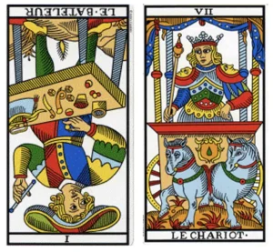 Le carte della settimana: il Bateleur rovesciato e il Carro.