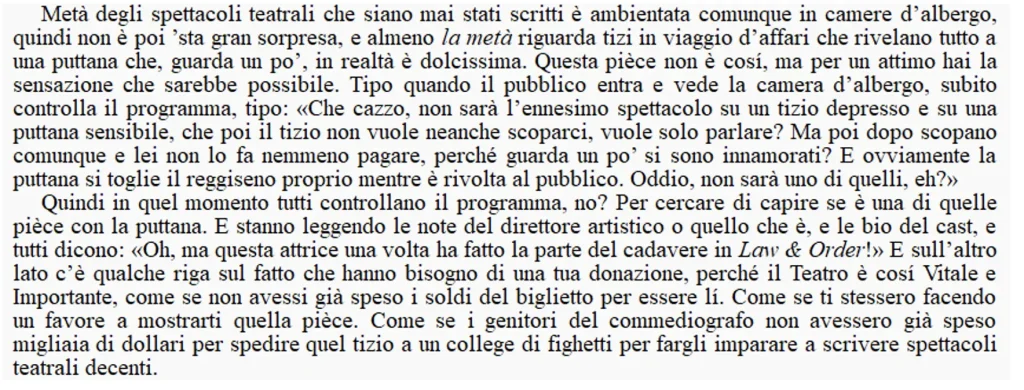 I racconti sono brevi e molto diversi tra loro. Volete sapere cos’è il teatro? è forse uno dei migliori perché è in perfetto stile Waksberg. Si apre con una presentazione comica e crudele del teatro indipendente per evolvere drammaturgicamente nella debolezza di una spettatrice: Dakota, la protagonista del racconto. Lei è la sorella del commediografo cui tocca presenziare in un teatro “delle dimensioni un camper” alla solita rappresentazione fatta con due soldi.