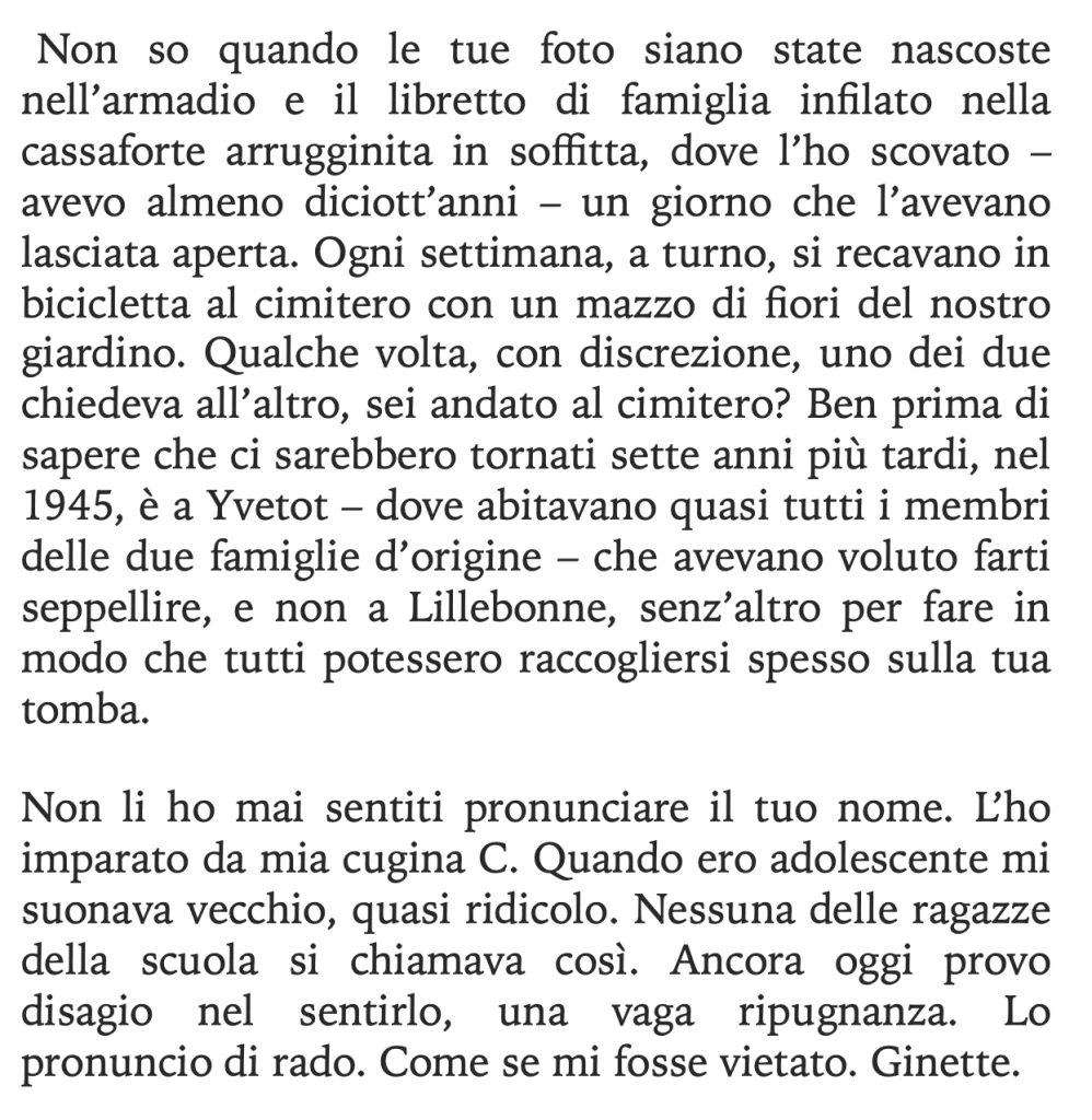 Ha reinventato l’autobiografia, ne ha esplorato ogni possibilità, senza risparmiare e risparmiarsi nulla. E L’altra figlia, la lunga lettera che scrive alla sorella Ginette, morta di difterite prima che lei nascesse, è proprio questo: un’autopsia feroce del lutto e dell’assenza. Una sorella di cui i genitori non hanno parlato più – quasi non fosse mai esistita. Il suo nome, così come le sue foto e i suoi effetti personali, sarebbero finiti in un posto segreto e inaccessibile, come soltanto il dolore può esserlo, se solo una domenica d’estate, per caso, Annie non avesse sentito la madre dire avere avuto un’altra figlia oltre a lei.