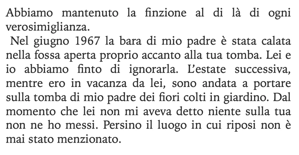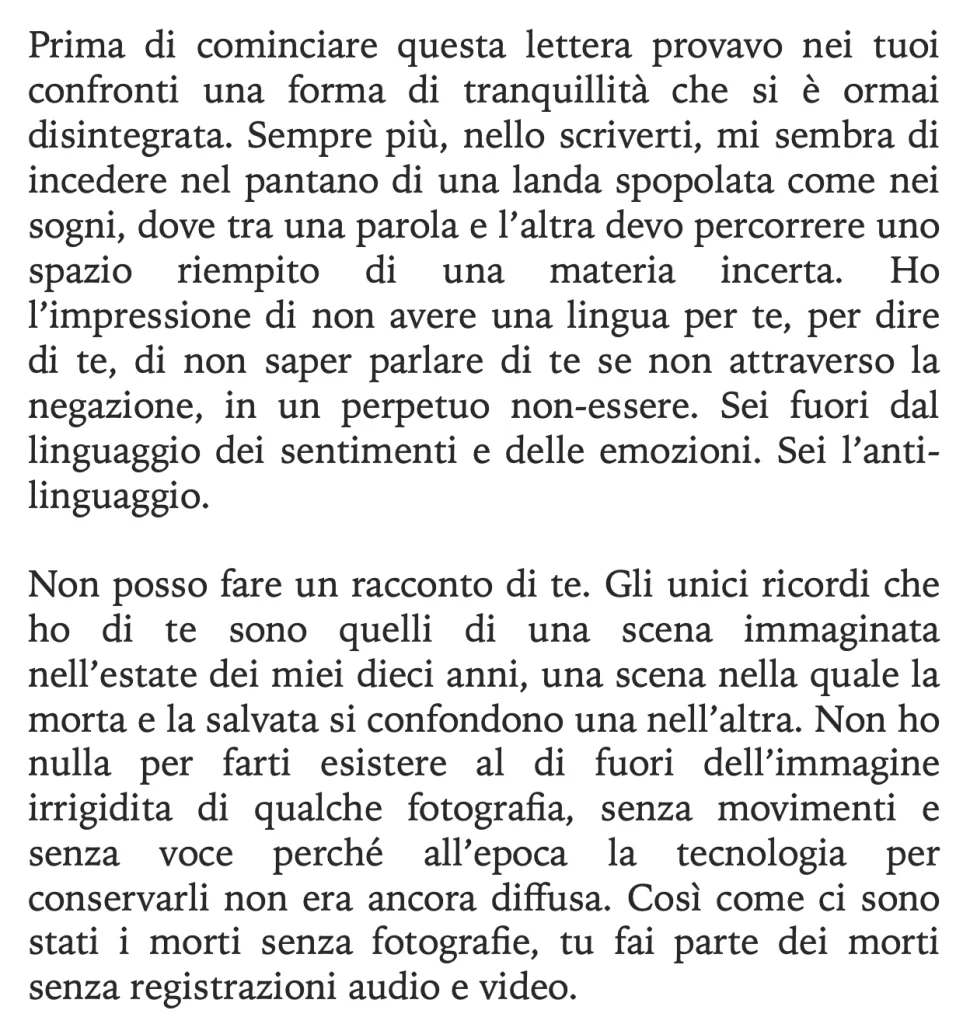 E in questa lunga lettera, che si legge tutta d’un fiato, l’autrice non fa niente per depistare il lettore, non omette niente, non concede e si concede nessuna indulgenza. Dice tutta la verità, che faccia male, sia scandalosa, oppure no.