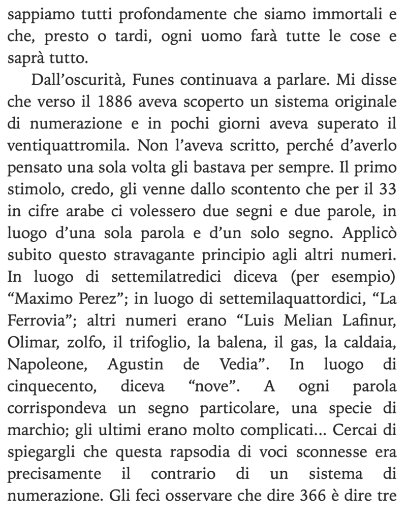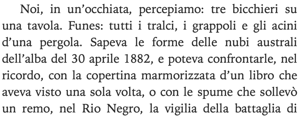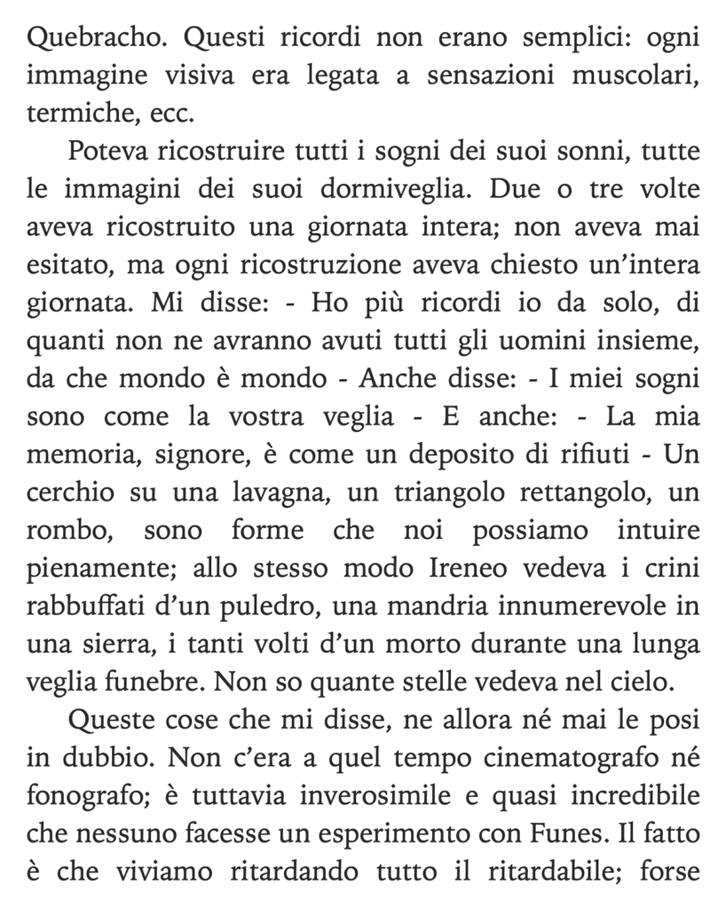 Questa settimana vi basterà una sola pagina per immergervi nella potenza dei sensi. Anzi, partendo da questa, vorrei leggeste tutto il racconto da cui è tratta. Scritto da Borges, Funes o della memoria è contenuto nella raccolta di racconti Finzioni. La storia narra di Ireno Fuentes, protagonista dalla memoria prodigiosa, incapace di formulare ragionamenti macroscopici ma infallibile nel memorizzare anche il più piccolo e fugace dettaglio. Cosa c’entra con i sensi? I sensi sono memoria. La nostra percezione sensoriale ci permette di contare ricordi e ricordi, più l’impatto sensoriale ed emotivo è potente, più il ricordo non se ne andrà mai. Eppure qui, a causa di questa peculiarità a tratti mitica del protagonista, egli è un uomo isolato, immobile nel corpo per via dell’incidente che lo ha reso incapace di muoversi, la sua dote incredibile non lo rende parte di nessun sistema, rendendolo solitario, immerso nell’incomunicabilità e privo di capacità relazionali.