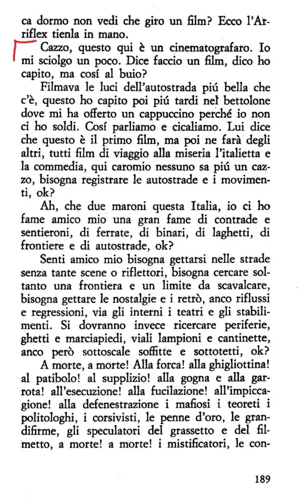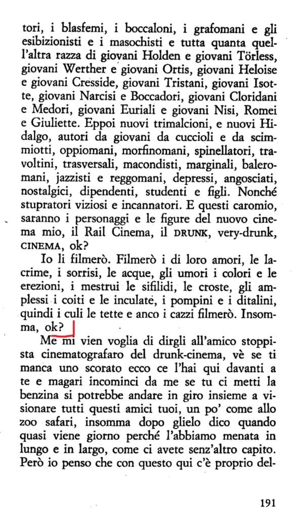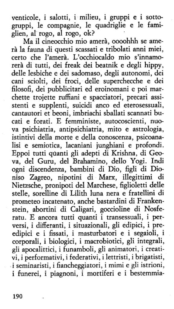 Io ho voluto far scaturire il fantastico dall’anima stessa degli uomini, ho immaginato di farli pensare e sentire in modo eccezionale dinanzi a fatti ordinari. Invece di condurli in mezzo a peripezie bizzarre, in mondi non mai veduti, in mezzo ad avvenimenti incredibili, li ho posti davanti ai fatti della loro vita ordinaria, quotidiana, comune, ed ho fatto scoprire a loro stessi, tutto quello che c’è in essa di misterioso, di grottesco, di terribile. E Tondelli aderisce al programma papiniano andando a scovare il fantastico nei posti più luridi di quello che negli anni ’70 e ’80 era definito underground: dal bar pregno di fumo stantio di una stazione al locale fricchettone arrangiato in un sottoscala; dall’abitacolo di una Seicento cenciosa alla soffitta dell’Annacarla di turno, dove si riuniscono i soliti compagnacci, a sbevazzare, a dir cazzate e dare calcinculo al tempo.