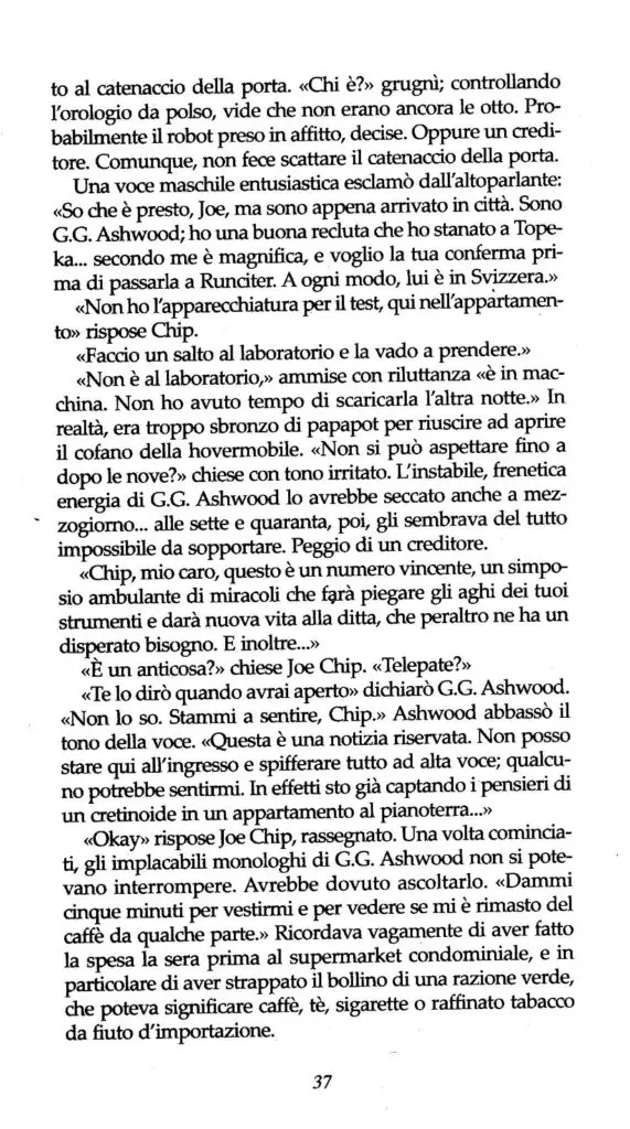 In un mondo dove le regole del business sono aggirate da telepati e precognitivi – i primi in grado di leggere il pensiero, i secondi capaci di prevedere il futuro – Joe Chip è la quintessenza della trascuratezza umana, il valor medio di tutti i difetti. Eppure, in virtù della sua competenza di esaminatore, ossia di tecnico capace di valutare i poteri parapsichici della gente, viene coccolato dal suo capo, Glen Runciter, che lo considera uno dei pochi dipendenti affidabili. A tal punto da incaricarlo di formare una squadra di anti-telepati e anti-precog per sgominare gli psico-terroristi di Hollis, suo principale concorrente. Ma la missione si rivela un tranello, Runciter muore in battaglia e Joe Chip si ritrova improvvisamente al timone della baracca. «Questo per me è un nuovo inizio. Un nuovo capitolo nella mia vita» ammette, conscio delle opportunità di rivalsa che la morte del capo gli offre. «Io voglio sfondare». Ma i sogni di gloria si spengono quando Joe Chip riconosce la calligrafia di Runciter nella scritta a pennarello rosso che trova vergata sul muro di un bagno: IO SONO VIVO, VOI SIETE MORTI. Grazie a uno dei ricorrenti voltafaccia narrativi di Philip K. Dick, veniamo a scoprire che Runciter è stato l’unico superstite della missione e le apparenti peripezie di Joe Chip e del resto della squadra non sono altro che i residui mentali di un gruppo di cadaveri mantenuti in semi-vita dentro celle frigorifere.