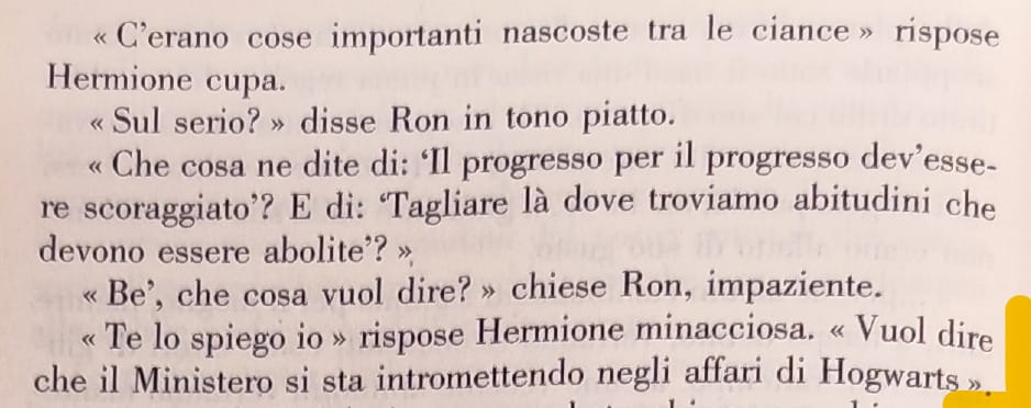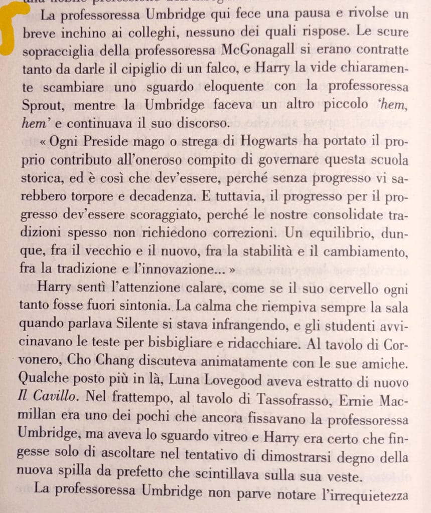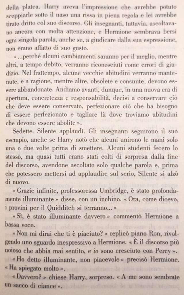 L’esempio che proponiamo è tratto dal romanzo Harry Potter e l’Ordine della Fenice, quinto capitolo della saga, pubblicato nel 2003. Per la precisione, la scena in cui Dolores Umbridge, neo aggregata al corpo docenti, pronuncia il suo discorso inaugurale di fronte all’assemblea composita di professori e alunni. Il livello del “detto” coincide con il significato letterale del discorso, uno stucchevole panegirico di cui Harry e Ron, protagonisti maschili, non si stancano di sottolineare la pesantezza, senza cogliere il sottile “non-detto” che di lì a poco avranno il dispiacere di sperimentare sulla loro pelle e che invece Hermione, protagonista femminile, non esita a spiattellare loro in faccia: “Il Ministero si sta intromettendo negli affari di Hogwarts”. Sembrano schermaglie fra ragazzi, ma sotto di esse scorre la vena aurifera dell'”indicibile” che, per chi sa leggere fra le righe, equivale a urlare al vento una verità scandalosa: nell’eterna contesa fra maschile e femminile, le femmine sono più sveglie dei maschi!