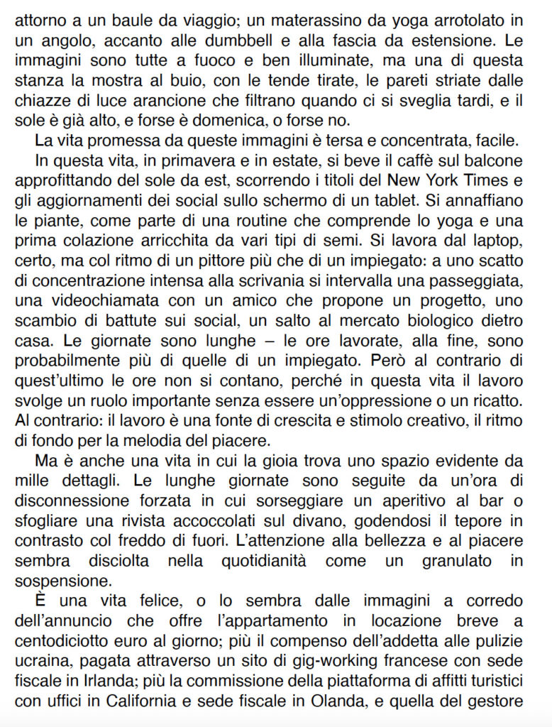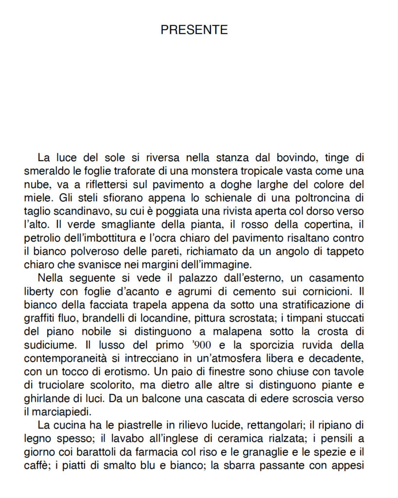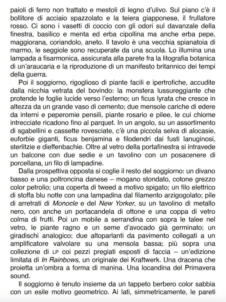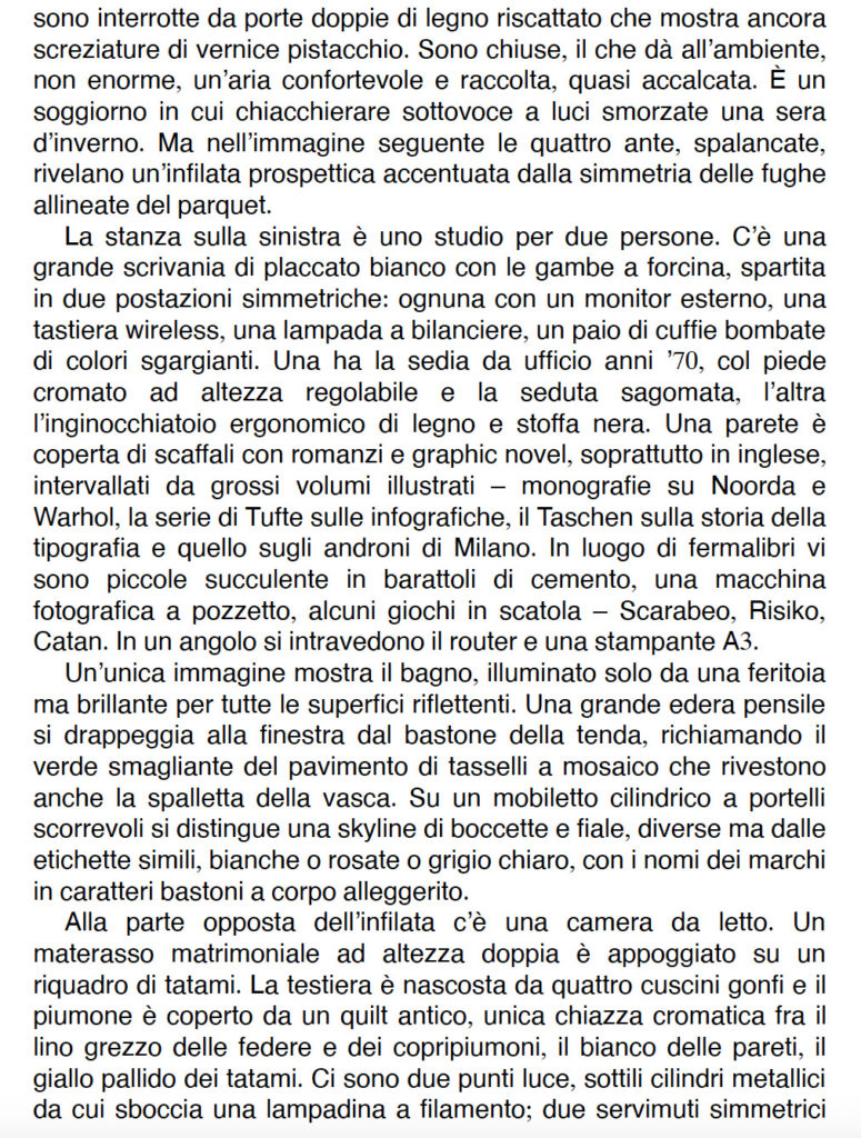 Del romanzo di Latronico ho ammirato la capacità di rendere l’ambientazione; nell’incipit che condividiamo, l’appartamento che ospiterà i due personaggi del romanzo viene descritto freddamente da un occhio esterno, tra un annuncio per un’agenzia immobiliare e l’allestimento di una scenografia teatrale.