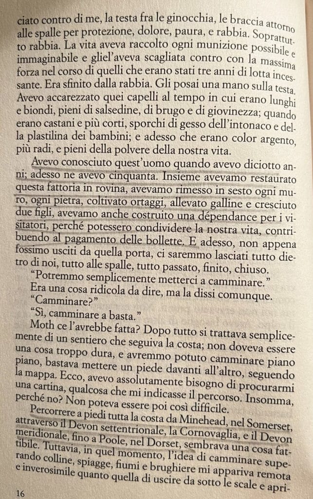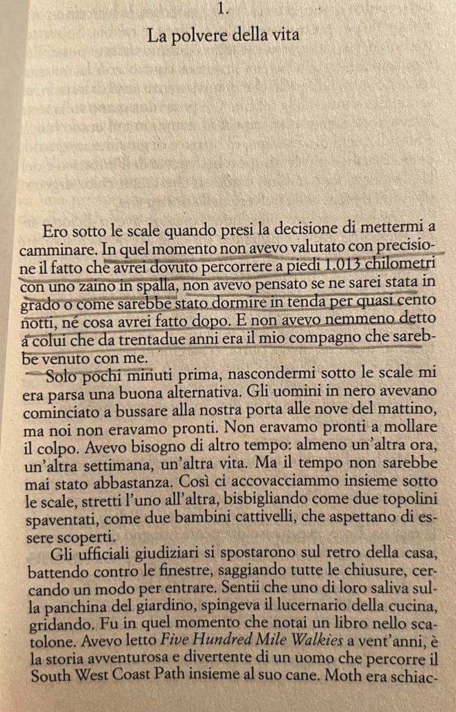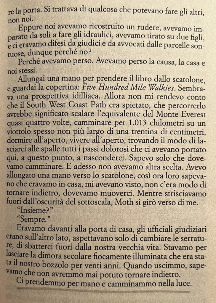 Cosa c’è di più potente di una storia vera raccontata in prima persona da chi realmente l’ha vissuta? Queste prime pagine tratte da “Il sentiero del sale” ci fanno immergere immediatamente in quello che è il dramma esploso nella vita di Raynor Winn, che da un giorno all’altro, per una palese ingiustizia, si ritrova, insieme al marito, a diventare una senzatetto. Non avendo un posto dove andare, decidono di incamminarsi e di percorrere oltre mille kilometri, zaino in spalla.