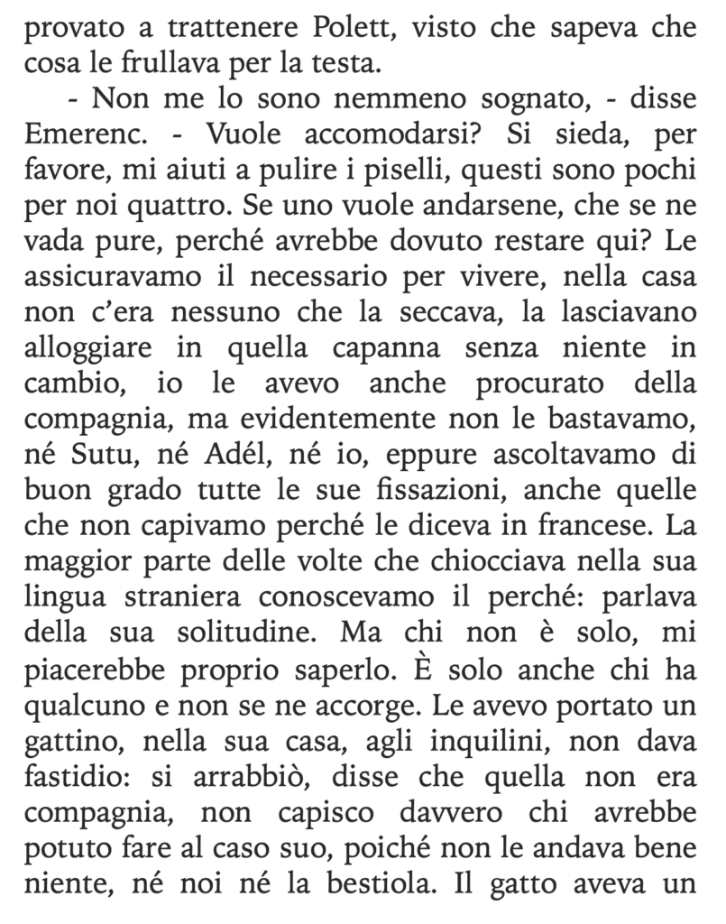 La terza cosa da dire riguarda il punto di vista da cui si guarda a una storia: ne La porta, la voce narrante non coincide con la protagonista, è colei che testimonia la formidabile vita di Emerenc, un’anziana signora che potremmo identificare come una fool: personaggio archetipico, potente, che genera una rottura nel consueto modo di comportarsi e rivendica una totale libertà di agire e comunicare al di fuori degli schemi sociali. Fool è, per esempio, il giullare alla corte di re Lear nell’omonima tragedia shakespeariana, colui che, attraverso scherzi e indovinelli, porta il re ad assumere consapevolezza della propria bassezza morale, che lo condurrà alla rovina. Un personaggio considerato “normale” sarebbe stato invece decapitato a metà della prima frase contro il sovrano. Fool è il clown, che accompagna chi lo guarda attraverso una complessissima gamma di emozioni che gli parla delle sue stesse sventure e piccolezze, rese sopportabili dal fatto che chi gliele mostra indossa abiti colorati e assume un atteggiamento scanzonato nei confronti dei peggiori incidenti.