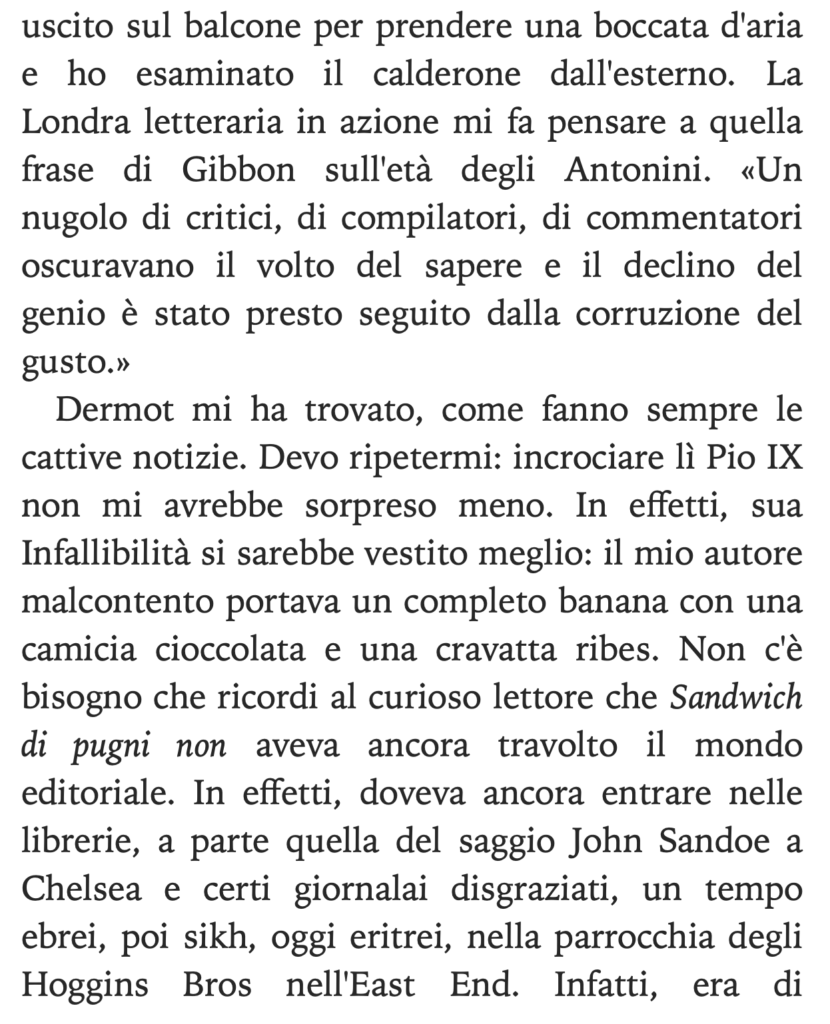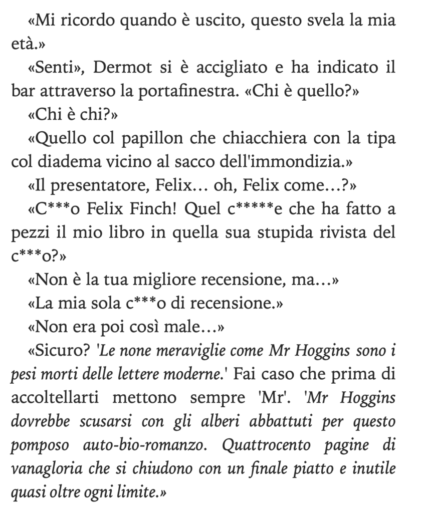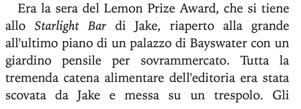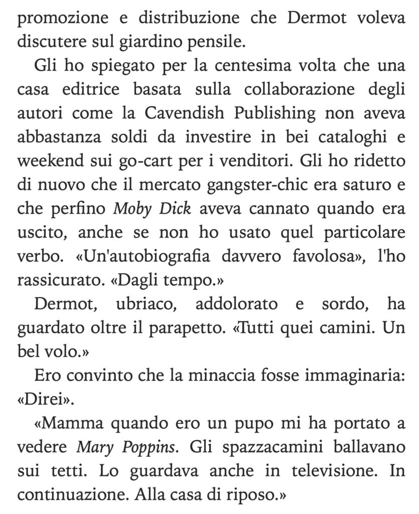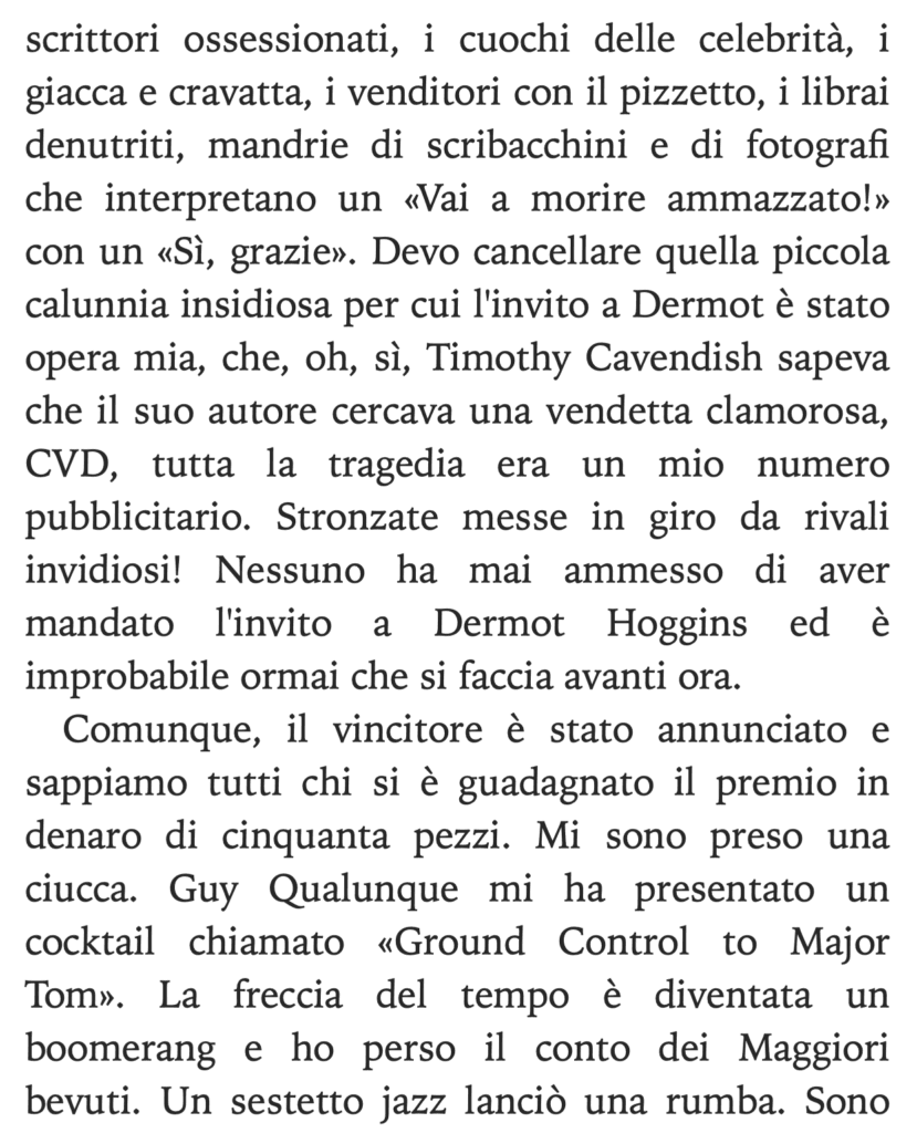 Il brano che proponiamo come esempio è tratto dall’inizio della quarta storia, La tremenda ordalia di Timothy Cavendish, con un protagonista che si esprime in prima persona dimostrando verso le faccende umane lo stesso connubio di acutezza e ironia che possiamo riscontrare nelle opere di maestri classici e contemporanei come Oscar Wilde e Woody Allen.