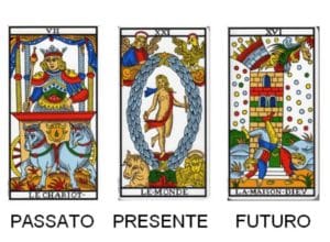 TAROLOGA: (Un po’ contrariata, trasforma il mazzo in una nuvola di carte coperte da cui estrae le solite tre).