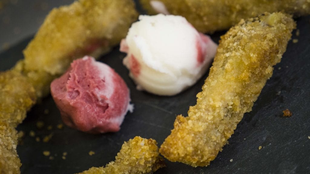 Pulled Pork e sorbetto di frutti rossi. Gelato di fagioli, sale pepe mandragola aglio